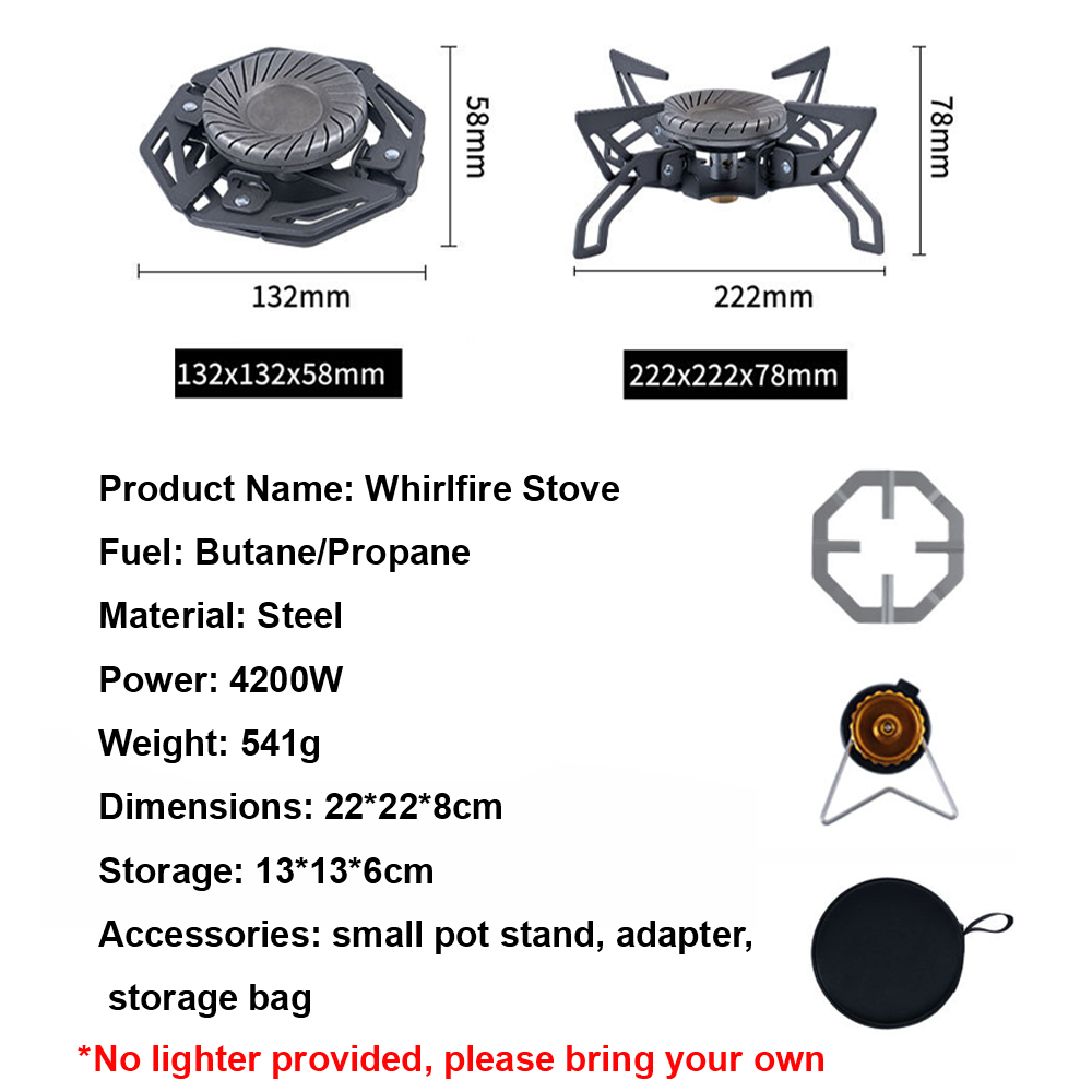 Product Name: Whirlfire Stove Fuel: Butane/Propane Material: Steel Power: 4200W Weight: 541g Dimensions: 22*22*8cm Storage: 13*13*6cm